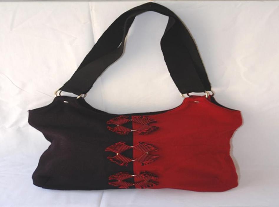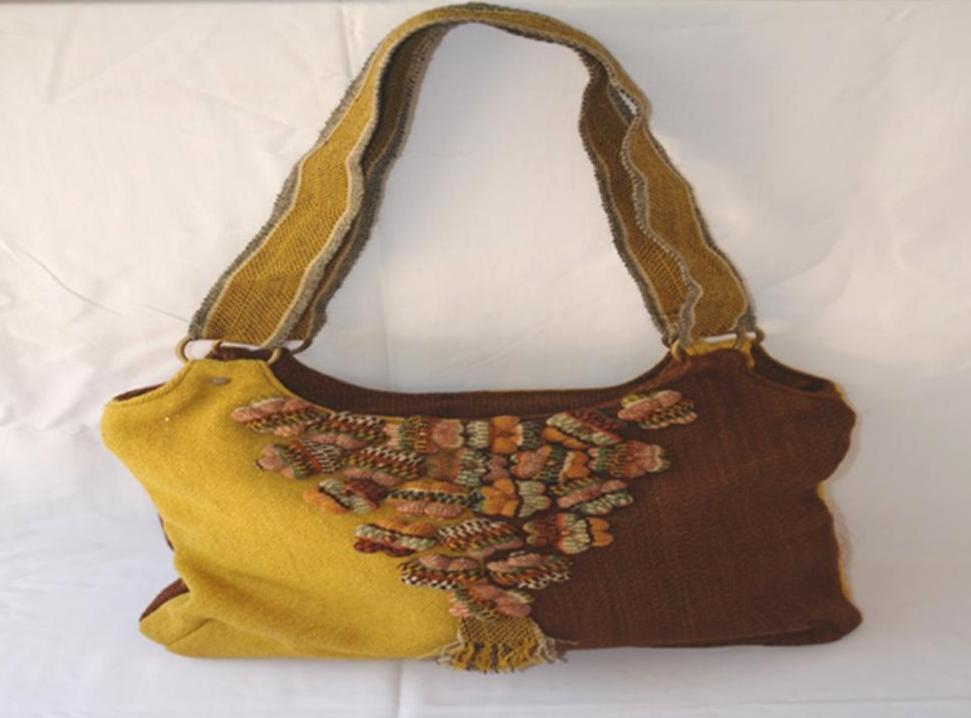 Bolso elaborado en telar de lana de ovino en dos colores, presenta en la parte delantera a modo de decoración en degrade florecitas hechas con retazos de telar. Para el asa se coloco aros de metal.