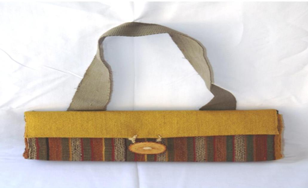 Elaborada con telar en lana de ovino e hilo perla. Su diseño a rayas de colores da un toque moderno, presentando en la parte delantera un adorno de flor, hecha con lana amarilla.