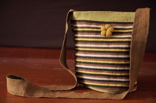 Elaborada con telar en lana de ovino e hilo perla, presenta en la parte delantera a modo de cierre un botón madera de sapote.
